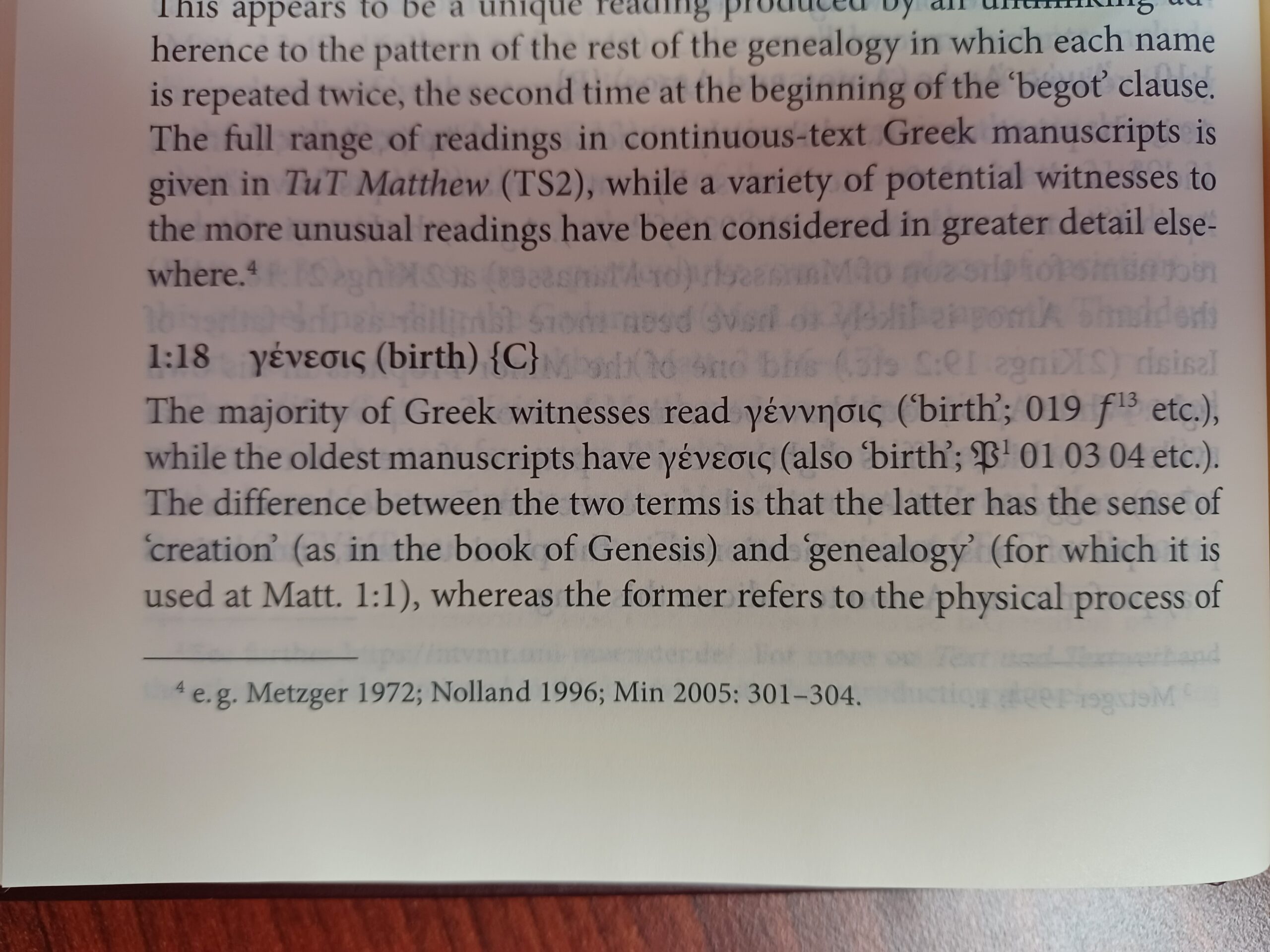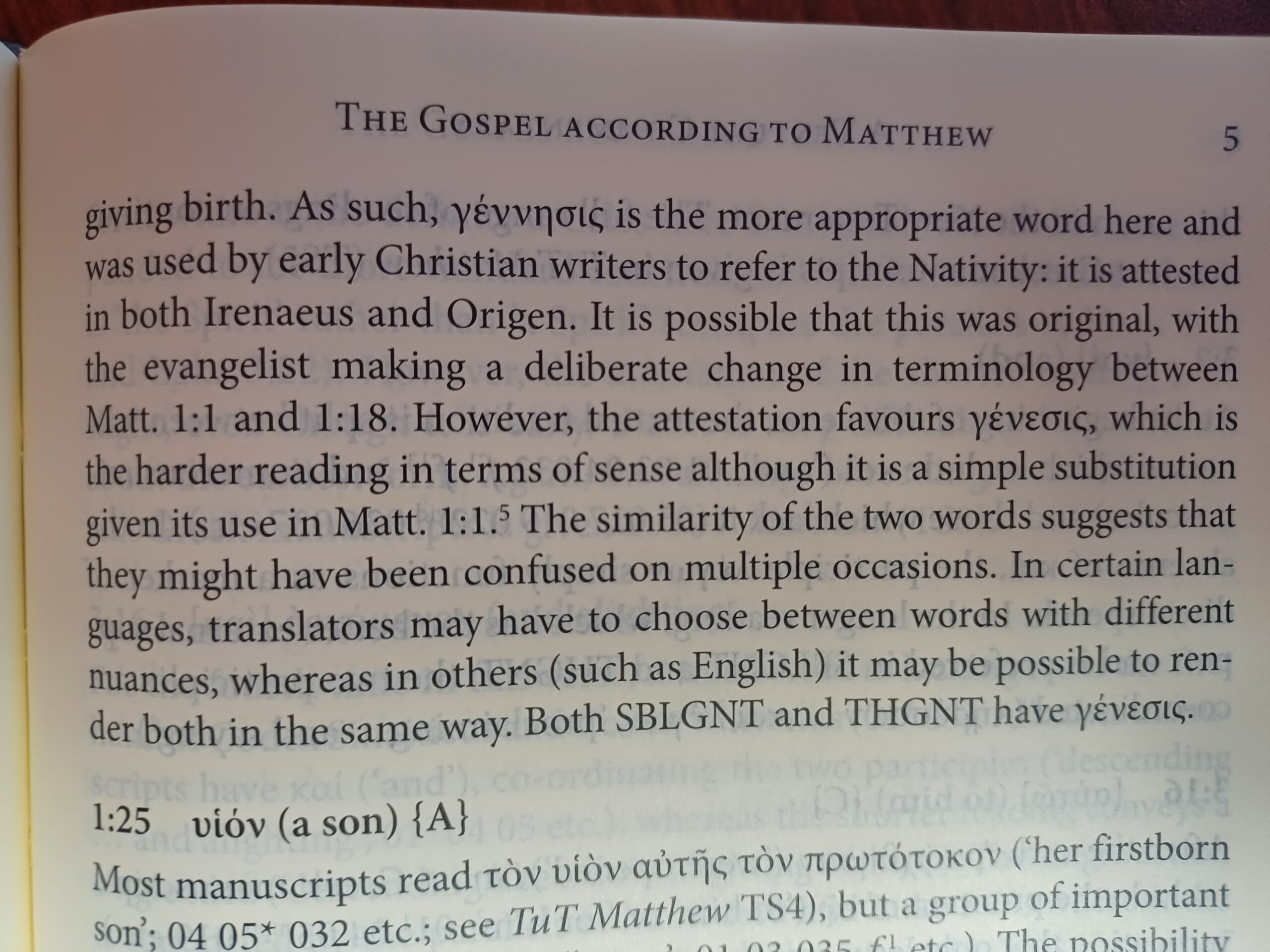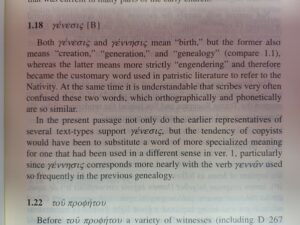 Houghton also interacts with recent scholarship, noting in a footnote that Tommy Wasserman has convincingly argued against theologically motivated scribes swapping in γέννεσις for γένεσις, as Bart Ehrman has suggested. Additionally, both the SBLGNT and THGNT have adopted the reading of γένεσις.